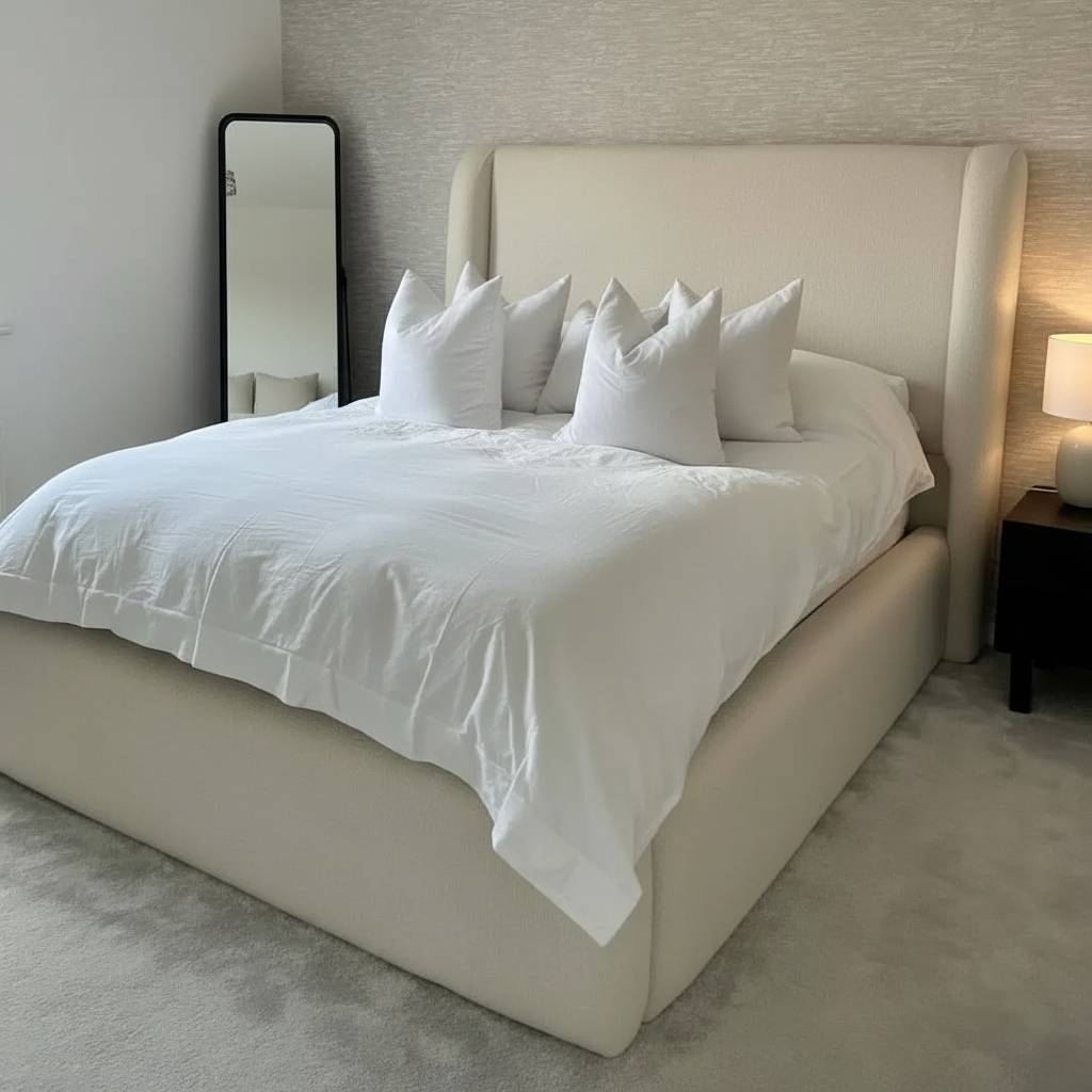 🛏️ DESIGN Tall, sculpted winged headboard with smooth upholstery and gently curved edges for a refined, hotel-inspired finish. Fully upholstered deep platform base with clean straight lines, carrying the same premium detailing all the way around. A bold yet minimal design that brings modern luxury and quiet elegance to any bedroom.