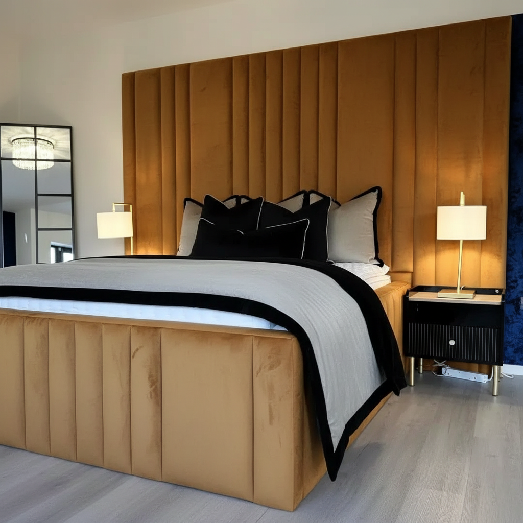 🛏️ DESIGN Spectacular full wall-width floor-to-ceiling headboard with bold wide vertical channel stitching for a rich, warm and theatrical finish. Extra-high raised sides with matching channel stitching running the full length of the bed, creating a deeply enveloping, cocoon-like feel. Tall high footend in perfectly matching channel stitch fabric, completing the fully wrapped, 360-degree immersive look. A truly unique bespoke design that surrounds you completely in warmth, texture and pure luxury.