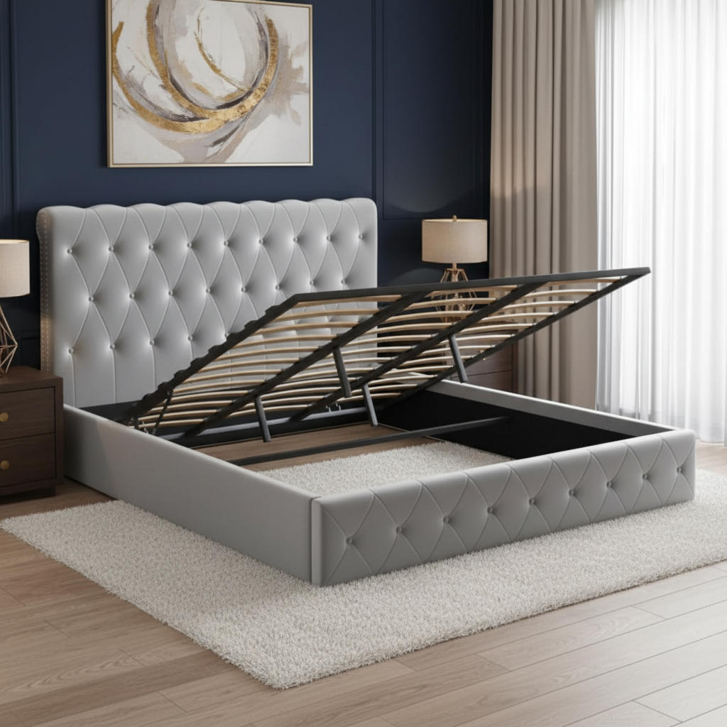 🗄️ OTTOMAN STORAGE Full under-bed gas-lift storage with smooth hydraulic mechanism — opens fully to reveal a massive storage space. Ideal for bedding, duvets, pillows and more. A clutter-free bedroom has never been easier.