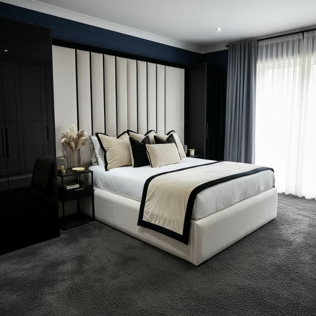 🛏️ DESIGN Dramatically tall, extra-wide headboard with clean, evenly spaced vertical channel panels that rise with striking presence and confidence. Sleek, low-profile fully upholstered base with sharp, clean lines that perfectly balance the grand scale of the headboard above. A bold yet refined modern design that works beautifully in both light and dark bedroom interiors.
